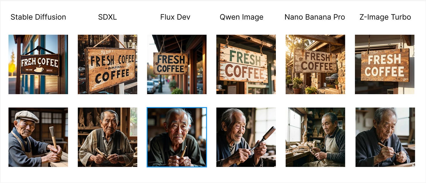 Comparing SD (2022), SDXL (2023), Flux Dev (2024), Qwen Image (2025), Nano Banana Pro (2025), Z-Image Turbo (late 2025) for a few use cases showcasing how far we have come in the last 3 years. Our definition of good output has changed with every massive release, and the frontier models have become bigger and bigger.